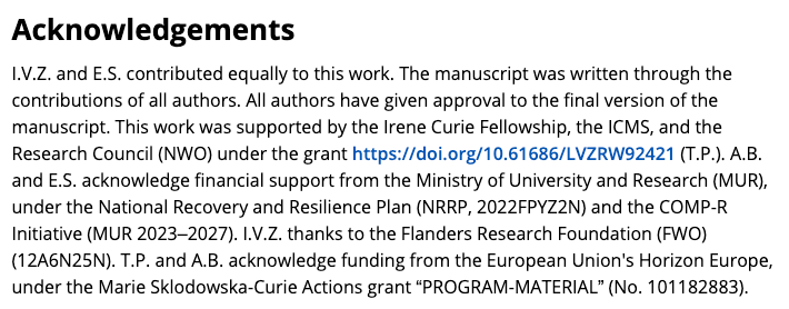 Let’s demonstrate that in an example. On the left, we see the acknowledgements section of a paper by Van Zundert et al. in the journal Small, published by Wiley. The authors acknowledge a host of funding organizations and grants, including NWO with Grant ID https://doi-org.ezproxy.csu.edu.au/10.61686/LVZRW92421. On the right, we see that the publisher has correctly included NWO in the metadata as the funder with our Funder ID, but there’s no reference to our Grant ID, instead mentioning an award number, which seems to refer to a Marie Sklodowska-Curie grant for the same research with their internal award identifier.